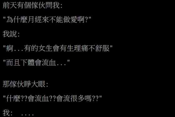 發問的女網友自己先表示,自己遇過一位26歲的男生,並非沒有女友,但是竟然不知道女生經期來會不舒服,而且會流經血,甚至聽到她說出會流血還瞪大眼睛問說「會流很多嗎?」,這也顯見其實台灣許多男生對於女生月經這檔事真的是不太了解。