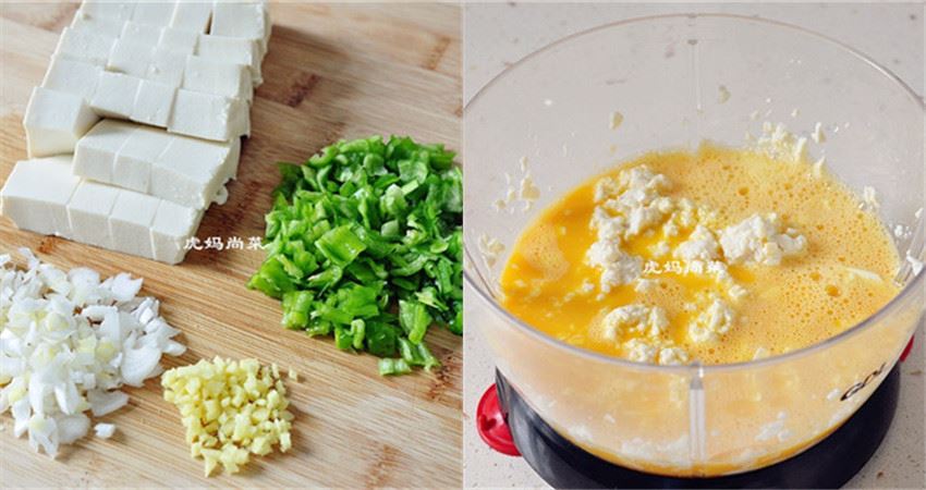 材料:嫩豆腐200克,雞蛋4個,薄皮青椒2個。