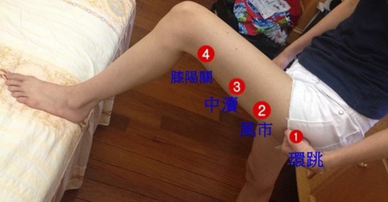 如圖每天在大腿外側的四個穴位點,用力敲打,每敲打四下算一次,每天敲左右大腿各五十次,也就是左右各兩百下。由於大腿肌肉和脂肪都很厚,因此必需用力,而且以每秒大約兩下的節奏敲,才能有效刺激穴位。