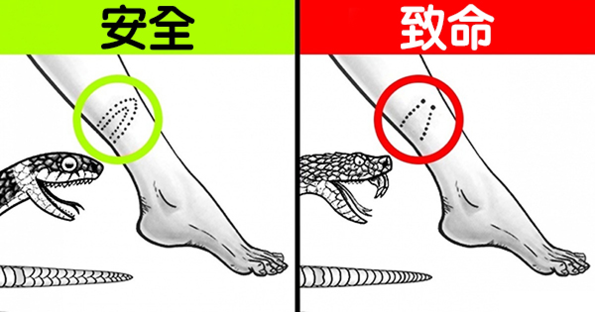 ▼12.判斷蛇有沒有毒:毒蛇的眼睛是豎瞳,無毒蛇的眼睛是圓瞳;毒蛇腹部的鱗片重疊,無毒蛇腹部的鱗片成叉狀;被毒蛇咬傷後門牙位置的洞比較大,被無毒蛇咬傷的話只會留下兩排牙印。