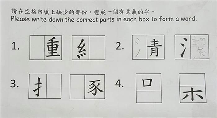 ▼這道題目要求小朋友們填入中文字「缺少的部分」,還要拚成一個有意義的詞。這聽起來簡單,但做起來超難。