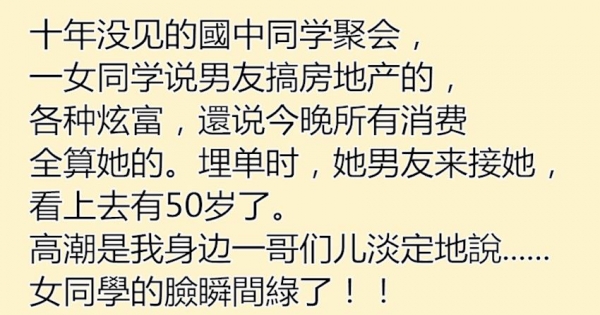 1、十年沒見的國中同學聚會,一女同學說男友搞房地產的,各種炫富,還說今晚所有消費全算她的。埋單時,她男友來接她,看上去有50歲了。高潮是我身邊一哥們兒淡定地喊了聲:「爸……」