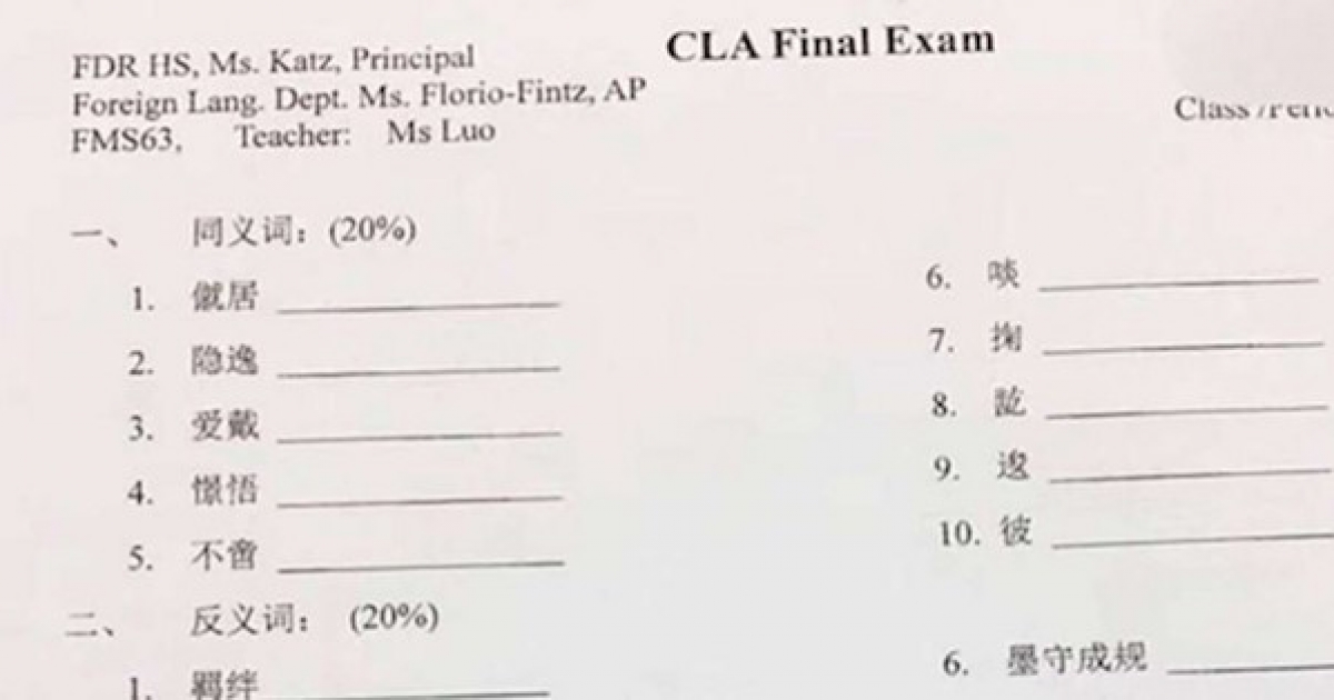 ▼就讀美國富蘭克林羅斯福高中(Franklin Delano Roosevelt High School)的學生都要選讀外語科目,其中一門就是中文,不過當大家看到他們高一的中文試卷時,都覺得這也太難了吧!