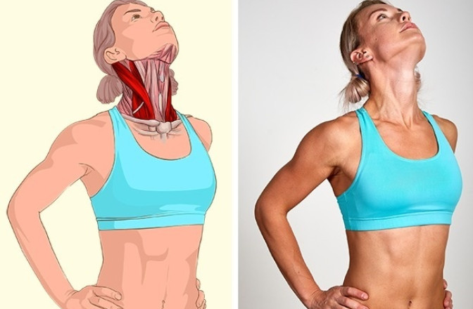 ▼胸鎖乳突肌:雙手輕放腰部,挺直後背,慢慢仰頭。
