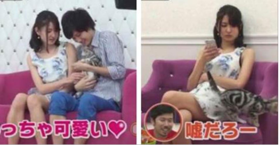 ▼他們先請女模和男模假裝拍攝情侶合照,再加入貓咪一同合照。在與拍攝結束後,女模在休息室與貓咪獨處時的反應作比較。
