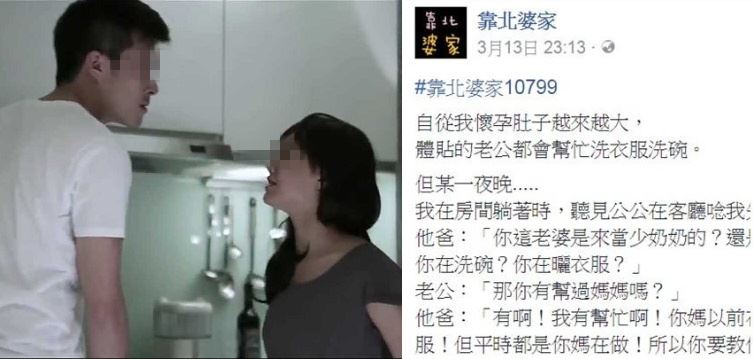 但某一夜晚…..我在房間躺著時,聽見公公在客廳唸我先生!他爸:「你這老婆是來當少奶奶的?還是她是你娶來生小孩的?怎麼都你在洗碗?你在曬衣服?」老公:「那你有幫過媽媽嗎?」他爸:「有啊!我有幫忙啊!你媽以前在坐月子的時候,我會幫忙洗衣服!但平時都是你媽在做!所以你要教你老婆啊!如果你不會教,爸爸幫你教!」老公:「你不用擔心,我們有我們自己的相處方式啊!」他爸:「有時候晚上那麼晚了,你老婆說肚子餓,你就會出去買東西給他吃!如果是我肚子餓,你會出去買給我吃嗎?」老公:「當然會啊!!!」他爸:「是嗎?真的嗎?!你要給他教啦!!(台語)」