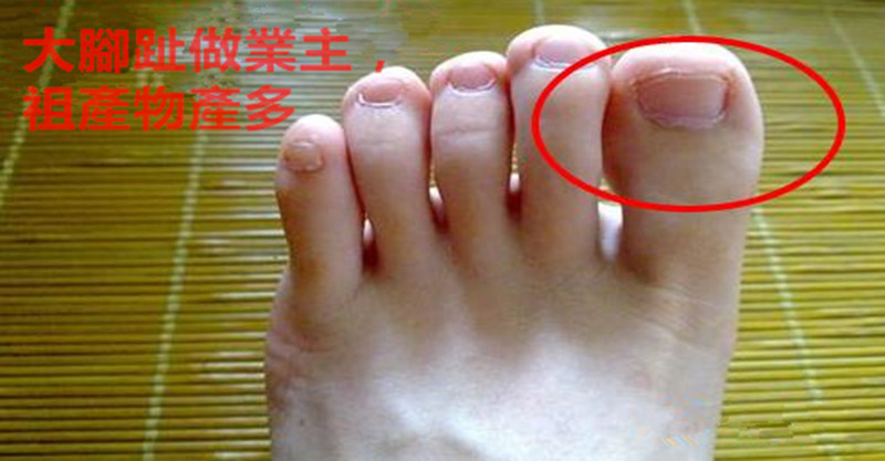 腳趾若是大隻、有肉,代表該人在房地產方麵較富有,擁有較多物業。腳趾短粗肉多,比較笨重的感覺,擁有這樣腳趾的人,性格誠實,穩重,待人真誠。同時他們還是一個很懂得享受生活的人,不會為了賺錢而賺錢,往往一生不愁錢。