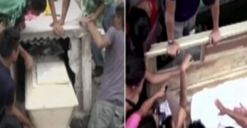 圖為少女親屬擊破水泥墓,把被活埋的人救出來。