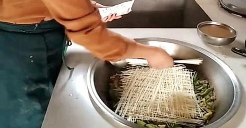 這不,她在鍋裡放入豆角、洋蔥,再加入適量的水和油,然後將乾麵條交錯一層層鋪在蔬菜上麵,
