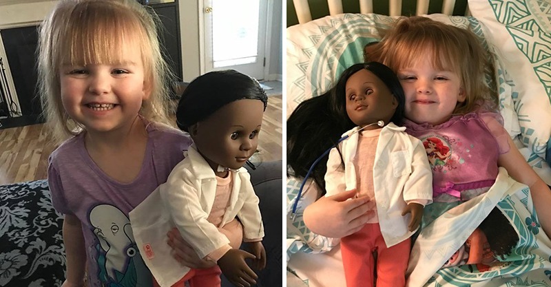 那天,布蘭蒂牽著蘇菲亞開心地走到商店,蘇菲亞看著牆上滿滿的漂亮娃娃,猶豫不決,直到下一秒她伸手抓住了黑皮膚的娃娃,開心的把它抱在懷裡說「要和娃娃做好朋友!」