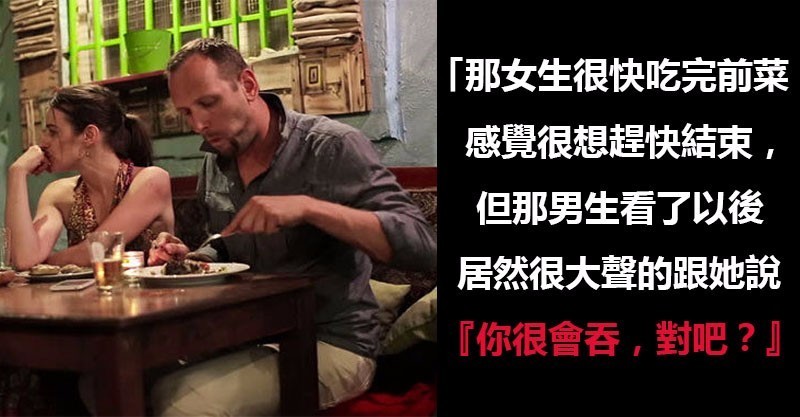 「那個女生很快就把開胃菜吃完了,我猜她是很想趕快結束這場約會。但男的居然還很大聲的跟她說:『恩,至少我知道你會吞東西,對吧?』那女生的臉立刻泛紅,並且跟他說這樣說話非常失禮,但那男的居然只是比出『噓』的動作,並回應:『喔,冷靜一點,反正我幾個小時內也會發現。』」