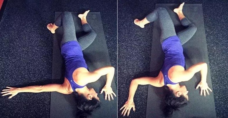 出體式時,慢慢解開雙手,然後在身前伸展雙腿,換邊重複動作。