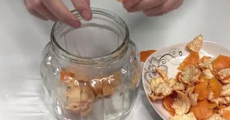 首先我們準備一個密封罐,然後將橘子皮撕成小塊裝入罐中