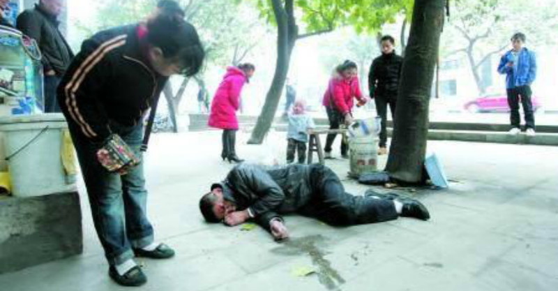 父親害怕對面躺著的人會有生命問題,跑了過去看了一下,發現原來是一個中年人暈倒在路上了。