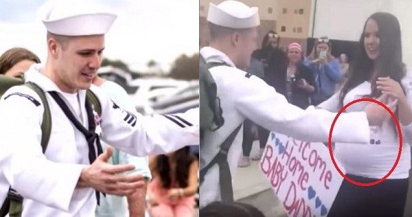 海軍老公看到老婆孕肚整個愣住,呆愣有3秒說不出話,隨後更戳了一下老婆的肚子,不敢相信地問:「這是真的還假的啊!?」克裡斯傻眼的畫麵都被在場的友人拍下,並上傳到YouTube。