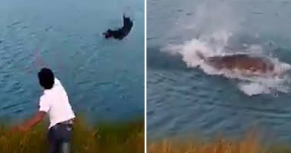 ▼從影片中可以看到,這名中二屁孩抓著一隻可憐小狗的脖子,奮力將牠扔進住滿了成群鱷魚的湖中。
