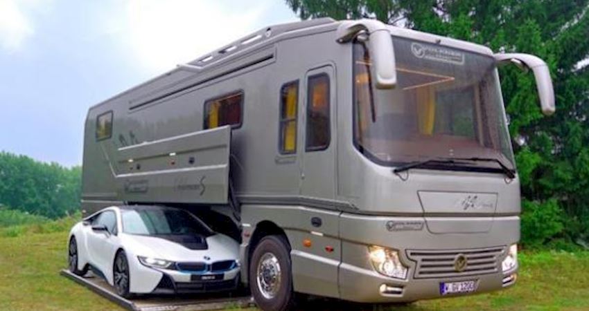 這輛房車是德國的一家汽車企業生產的,因為車內配置相當豐富,所以被稱為超級房車。車的底層不僅可以放進一輛寶馬i8,車廂內部也是配備齊全,人們更喜歡把它叫做移動的總統套房。