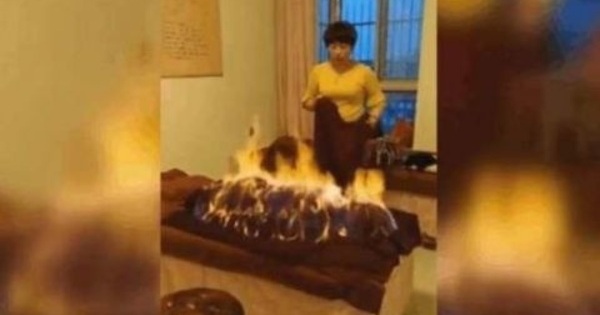 隨後在毛毯上加了一些比較特殊的物質,技師便用打該火機“嘭”的一聲點燃了毛毯。頃刻間,熊熊大火燒成了一個“人”字形,將女子包裹了起來,畫麵看著令人打哆嗦,但令人驚奇的是,女子和技師卻毫無反應,似乎見怪不怪,技師很淡定的看著大火熊熊燃燒,女子卻沒有絲毫不適的反應。