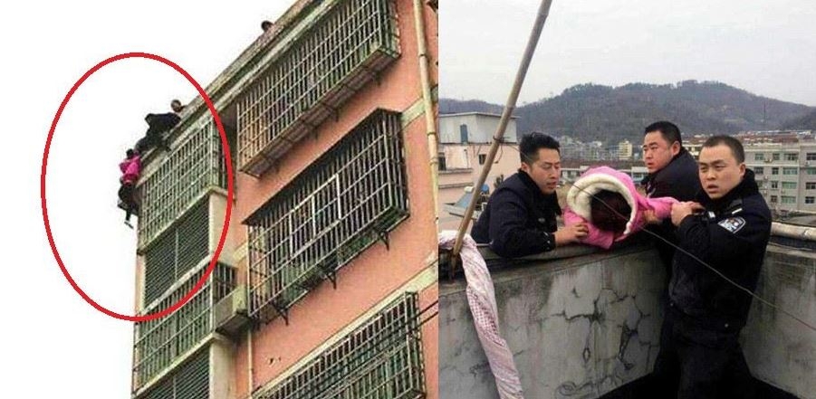 ▼當時那名女子從頂樓一躍而下,千鈞一髮之際,丈夫只抓住了她的馬尾。她兩腿完全懸空,幸好護欄外有一道寬不足30公分的排水管,能夠支撐部份身體重。