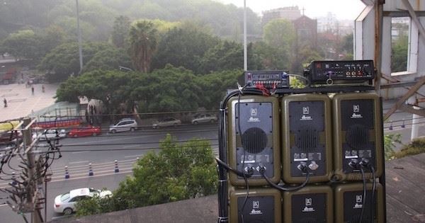 ▼這組音波炮就被放在4樓平台上,大媽一跳廣場舞就立刻發炮,播出:「請遵守中華人民共和國環境噪聲汙染防治法,立即停止違法行為!」強大的威力徹底蓋住了廣場舞的音樂聲。