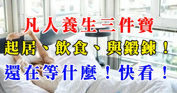 大多數人都是凡人,都有煩惱事,想要做到沒有煩惱、仙風道骨,那是不可能的,因此,不能夠有樣學樣,人家能做到的養生方法,你不一定適合,對於普通人來說、對於凡人來說,養生有三件寶,一個是起居、一個是飲食、一個是鍛鍊,這三件寶,是凡人養生必須要做到的,也是任何有經驗的養生人士,在談到養生的時候,都不可或缺和忽略的話題,對於絕大多數人來說,都有參考意義,下麵具體來說說這“三件寶”!