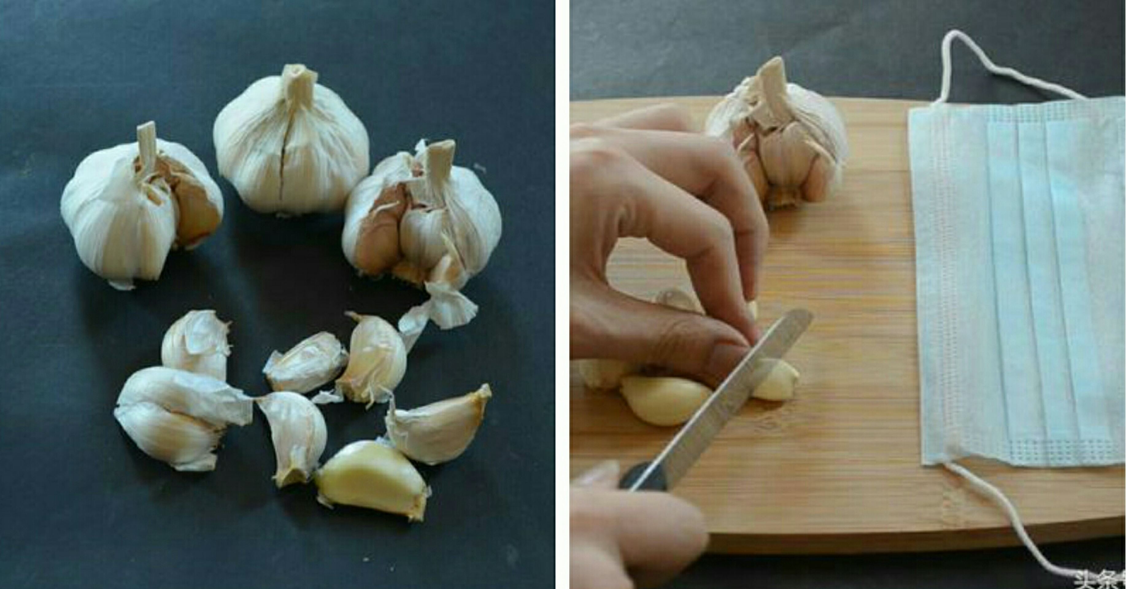 首先準備幾瓣剝了皮的大蒜和一次性口罩。