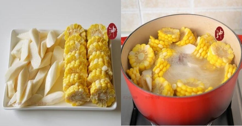 3.山藥去皮切滾刀塊,玉米切塊。