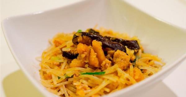 KATIE』S 烹調過程 1.先將香菇倒入鍋中幹煸3分鐘,將香味炒出。 2.再倒3大匙油,把香菇、絞肉、蔥段,中火爆香約2min。 3.加入南瓜泥拌炒,並加入香菇素蠔油調味。 4.將米粉加入到鍋中,並緩緩加入1~1.5杯水,持續以小火拌炒約5min。 5.最後可在鍋沿放下油蔥酥炒約1min,再跟米粉炒勻。 6.起鍋前,看鹹度可適量加入1湯匙醬油及白鬍椒粉,與米粉炒勻即可上桌。  KATIE』S 美味秘訣 1.南瓜有分兩種,橘色南瓜是不可吃的硬殼,綠色南瓜是可吃的細軟皮,兩種南瓜都可放置電鍋蒸熟,但橘色南瓜硬皮會裂開,可直接將硬皮拿掉,綠色南瓜的軟皮可直接用湯匙刮掉,或是可將綠皮一起壓成泥,橘色南瓜絕對不可以整顆放進微波唷!否則會發生意想不到的慘事。