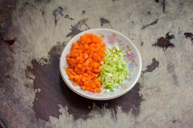 準備材料,金針菇洗乾淨,胡蘿蔔切丁,香蔥切蔥花。