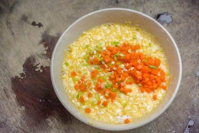 雞蛋打散加入麵粉、胡蘿蔔、香蔥和一些清水,調成雞蛋麵糊,加點鹽。