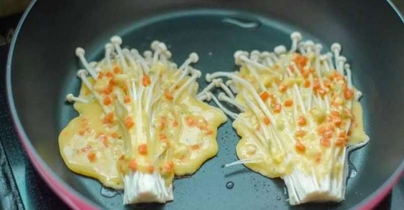 金針菇澆上麵糊後,瞬間變成了繁茂的樹枝;再加上胡蘿蔔和蔥花的點綴,就好像一棵開了花的樹~