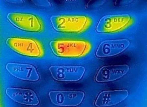 我們可以看到,這種塑膠製的手機按鍵被熱感應照相之後就能看出來,按照顏色的深淺就能判斷出按鈕的順序,最淺的1是最先按的、最深的5則是最後按下的。