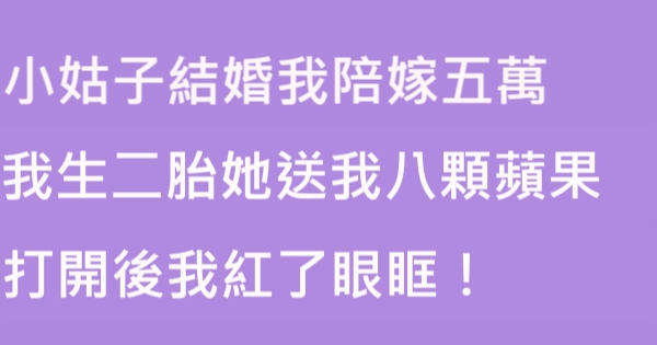 這下兒子女兒都有了,湊成一個好,老公別提有多開心,整天抱著女兒不撒手,小姑子得知我生了,急忙從外地趕回來。進門的時候,我看到小姑子手上只拎了一袋蘋果,她放下蘋果去了衛生間,婆婆當場就不高興了,說小姑子不懂得人情世故,我讓給婆婆使了個眼色,示意她別說,小姑子能特意回來看望我,我已經很開心了,至於送什麼不重要,也有可能是養殖場出現了問題,所以我一點都不會計較這些。