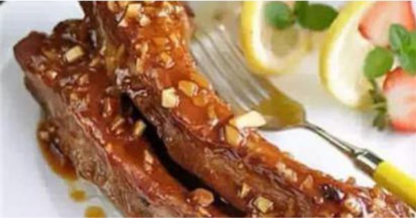 8.烘烤結束,將錫紙打開,排骨取出裝盤。將錫紙內的湯汁和醃料剩下的湯汁一起倒入鍋內,開火,淋入少許濕澱粉勾芡,熬成粘稠的湯汁,澆到排骨上即可。