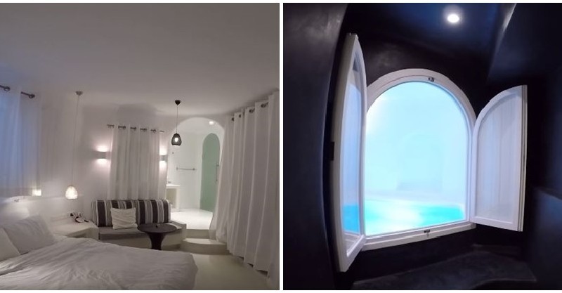 當時大衛和妻子一起前往希臘聖托裏尼島旅行,並入住了「Dana Villas andSuites」飯店,卻發現這個飯店似乎有些特別,於是大衛二話不說就開始拍攝...只見飯店房間內部不但有著舒服的大床,裝潢則是以白色為主體,看起來低調卻又不失奢華。
