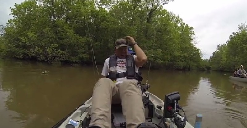 ▼好不容易「這條魚」終於被拉出水麵一點點,但簡直把他們給嚇壞了,魚餌一丟趕緊劃船逃跑!