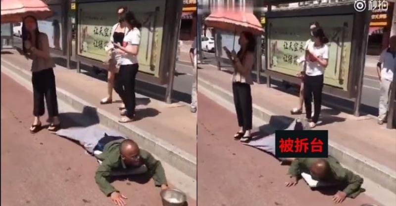 雖然真的有不少乞討者是因為身體上的障礙只好在街上靠愛心度日但總是有人假借身體障礙騙愛心最近大陸流傳一段影片真的是讓人看了傻眼呀!圖片皆翻攝自網路乞討者似乎是小兒麻痹趴在滑板上沿街乞討到公車站前意外被要招公車的妹子踩到褲管圖片皆翻攝自網路