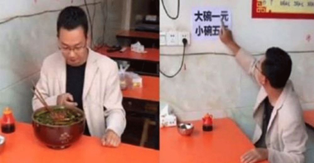 原來男子在看到麵館內貼的:大碗一元(約5新台幣),小碗五元(約25新台幣)的字樣後,惡狠狠地點了一份大碗的麵。見到老闆端上來一大碗麵後,男子想著這下可要美美地吃上一頓了,但是這麼大一碗麵,男子哪兒吃得完。還剩有很多麵,男子就已經撐得不行了。