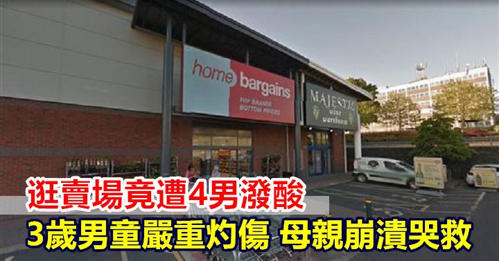據外媒報導,該起事件發生在週日下午2時15分,當時3歲男童與母親一同在伍斯特郡(Worcestershire)「Home Bargins」大賣場逛街,不料坐在推車裡的男童竟當場遭攻擊,4名男子突然朝他潑帶有大量腐蝕性的液體,男童當場痛得大哭,一旁母親則嚇得放聲求救,並大喊「你們對我的孩子做了什麼?」4名男子犯案後逃之夭夭,男童送醫後已無生命危險,不過由於遭受嚴重灼傷,目前仍在住院觀察。