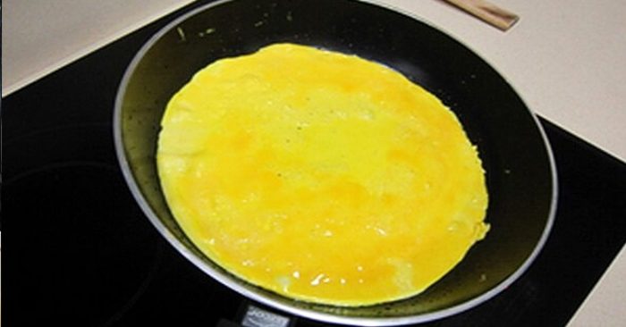 蛋汁倒入鍋內,不要急著攪動,若蛋汁煮開冒泡。