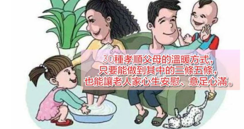 父母無私的愛永不忘,下文為您提供30種孝順父母的溫暖方式,縱使您現在一無所有,只要能做到其中的三條五條,也能讓老人家心生安慰,意足心滿。
