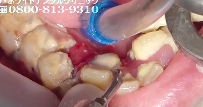 女孩的牙結石牢牢附著在牙齦上,有些比牙齒還大,情況很嚴重。