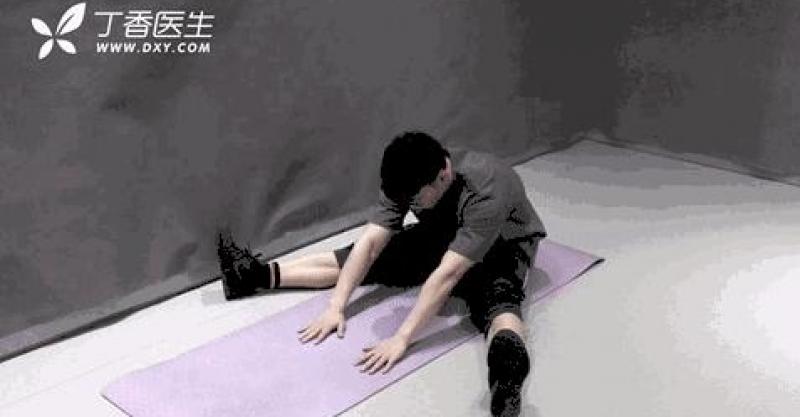 把腿分開伸直,緩慢地向前伸直雙臂,俯身彎腰。