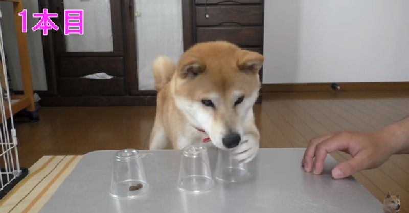 其實對狗狗來說這種猜杯子的遊戲應當是相當簡單的,嗅覺靈敏的牠們只要聞一聞立馬就能猜出飼料在哪個杯子,但今天主人想看看如果讓小春能看到飼料藏在哪個杯子,牠是不是能更容易的猜到呢?