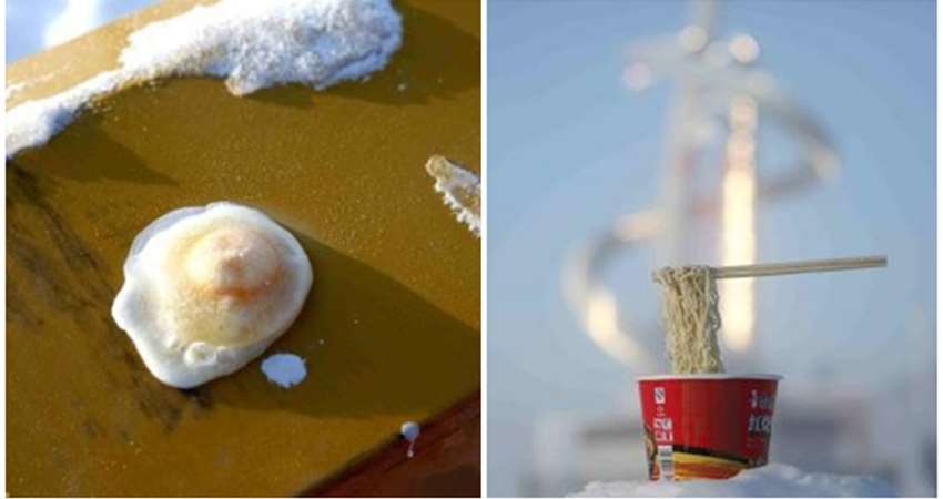 呼中的寒冷則是以「最冷」和「速凍」為特點,該地歷史最低溫是零下53.2℃,而為了讓外界更能瞭解當地的低溫有多可怕,還有民眾冒著寒冷在戶外做實驗,例如他們將蛋打在鐵板上,不一會這顆蛋就成了「冰蛋」,而當用筷子挾起熱呼呼的泡麵麵條時,原本熱熱的麵條也瞬間被凍成「冰川」,就連將剛泡好的紅茶淋在鐵管上也馬上變成「紅茶冰川」,足見這裡的低溫有多驚人!