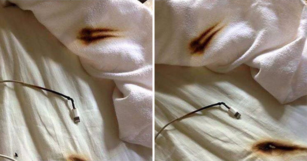 ▼前幾天,新罕布夏州消防局在臉書上分享了一係列照片,說:「調查顯示,53%的孩子將手機、iPad放在床上或者枕頭下充電。這非常危險。無法散熱的話,這些設備的溫度會越來越高,最後床會會被點燃。