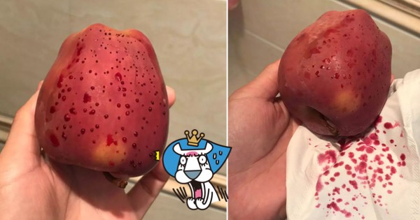 沒想到吃個午飯回來,蘋果表麵竟滲出一點一點的紅色「血珠」,令人不寒而慄!▼