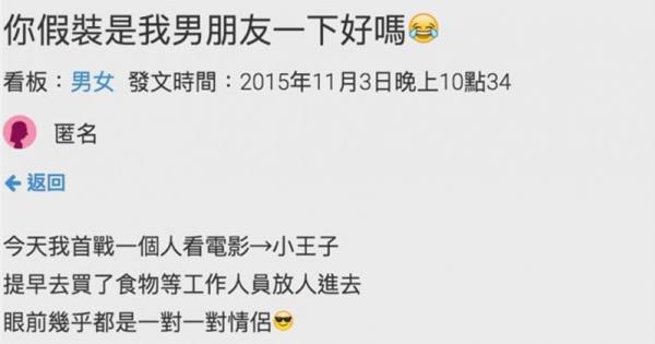真的很愛演 XDD 如果遇到前任,說真的還不知道怎麼反應 是我的話,我就閃遠一邊去 當沒看到 遇到當不認識,問你哪位這樣...免除很多麻煩  Dcard 原文:你假裝是我男朋友一下好嗎 今天我首戰一個人看電影→小王子 提早去買了食物等工作人員放人進去 眼前幾乎都是一對一對情侶
