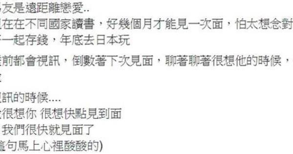 我:我很想你 很想快點見到面 男友:我們很快就見面了 (聽到這句馬上心裡酸酸的) 男友:我們很快就一起去日本了 男友:我很快就畢業了 (講到這裡我已經有點小哽咽) 男友:我們很快就一起工作了 男友:我們很快就結婚了 男友:我們很快就生小孩了 男友:我們很快就一起變老了 (我腦海裡一直浮現畫面 整個很催淚) . . . 男友:我們很快就去投胎 了..... (馬上幻想破滅 我差點罵出髒話) 乾 為什麼我男友這麼靠北..... 乾 ------------------------------------------- 網友回覆: 「靠背 最後一句話 真的蠻靠北的 害我笑出來」 「男友:我們很快就去墮胎了.....」