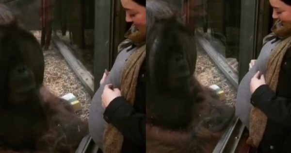 當他們來到大猩猩園區時,裡麵的紅毛猩猩竟然對著她的肚子做出這個舉動…